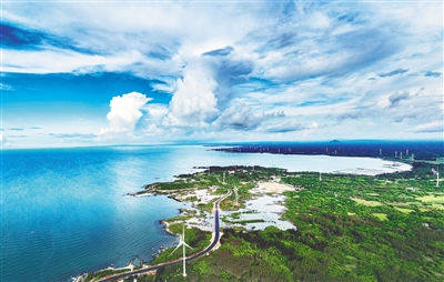 在东方市感城港湾,风车沿着海岸线排列,风光旖旎。这是东方市风电基地,目前已并网运行,每年可新增绿电2.49亿千瓦时,海上绿电通过大电网源源不断送入千家万户。