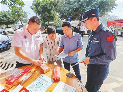 琼海市局执法人员联合琼海海警局执法人员在潭门镇渔港码头开展普法宣传。海南烟草供图