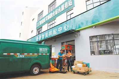 在海口三门坡镇寄递物流共配中心,海南邮政工作人员交接快递邮件。黄文燕 摄