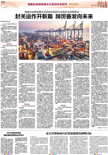 潮涌南海,奋楫扬帆。全岛封关后,海南具备在更大范围、更深层次推进开放的基础条件,面临更广阔的发展机遇。以全岛封关为里程碑,我们当牢记嘱托,深刻领会海南自由贸易港建设的重大战略意义,深刻认识践行这一国家战略的长期性、复杂性,在党中央坚强领导下,密切协作、主动作为,奋力实现“把海南自由贸易港打造成为引领我国新时代对外开放的重要门户”战略目标。