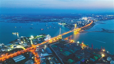 夜幕下,儋州市环新英湾区域灯火璀璨,生活气息浓厚,展现出港产城融合发展的强劲动力。