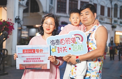 12月18日,海口骑楼老街中山路段,市民游客手持当天上午出版的《海南日报》号外以及“12·18见证历史时刻”手持牌,通过自助式拍照机,为全家拍下一张记录历史时刻的“封关首日”纪念照。
