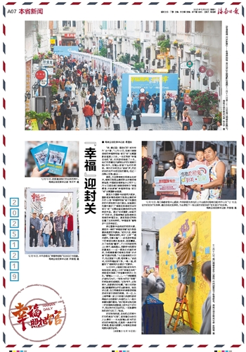 ■ 海南日报全媒体记者 蔡曼良“来,看这里!跟我们的‘封关号外’合个影。”12月18日,在海口骑楼老街的幸福照相馆·首日“封”主题摄影绘画展入口处,一台定制版“幸福自拍机”前,市民游客排起了小队。他们手持着当天新鲜出炉的《海南日报》号外,在镜头前留下灿烂的笑容。照片打印机发出“滋滋”声,历史时刻的庄严与老百姓的喜悦,在这一刻得以定格、融合……