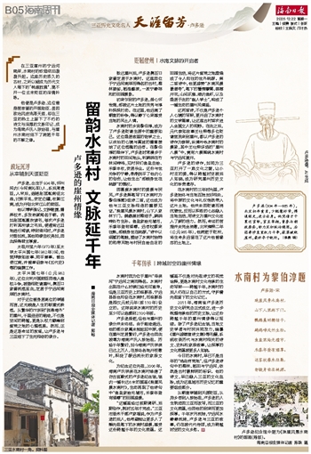 为纪念这位先祖,2006年,海南卢氏宗亲在水南村修建了仿古宫殿式的卢多逊纪念馆,馆内一幅长达6米的国画《珠崖风景水南村》,生动再现了他诗句中“鱼盐家给无墟市,禾黍年登有酒樽”的田园盛景。