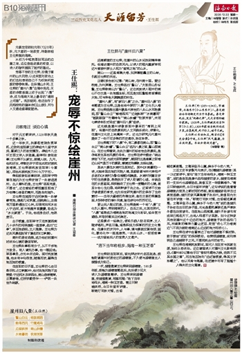 宠辱不惊的王仕熙,忘情于崖州的山水风物,以此来面对政治上的打击和表明自己不为权势所屈服的铮铮铁骨。在纵情山水间,王仕熙的“崖州八景”在笔中流泻,天涯的诗歌版图上终于出现“八景”诗,成为海南大地上最早的“清明上河图”。流放期间,他还创作了风格独特的骚体诗《云山辞》,并为人文遗迹盛德堂题诗。