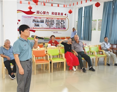昌江红林老年人日间照料中心,陈国阳在唱歌。