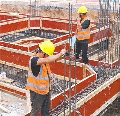昌江思源实验学校综合教学楼建设现场,工人在绑扎钢筋。