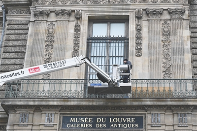 法国卢浮宫23日给这座博物馆的阿波罗长廊一处临街窗户加装防护栅栏。今年10月歹徒抢劫珠宝时,正是从这处窗户闯入。新华社/美联