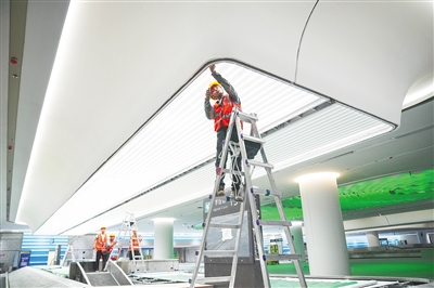 三亚凤凰国际机场三期项目T3航站楼施工现场,工人们忙着组装安检设备、清洁室内环境以及屋面板安装收尾等工作。