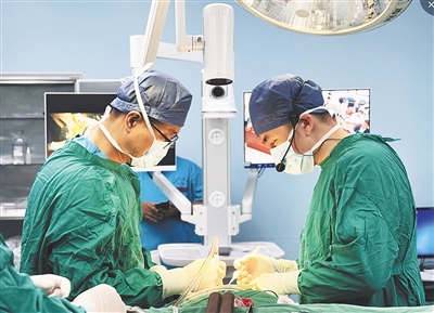 吉林大学中日联谊医院常驻琼海医疗队帮扶专家张伯寅(右)在开展手术。受访者供图
