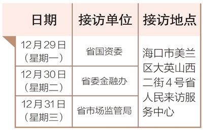 12月29日至31日,省国资委、省委金融办、省市场监管局相关负责人将在海口市美兰区大英山西二街4号省人民来访服务中心接访群众。