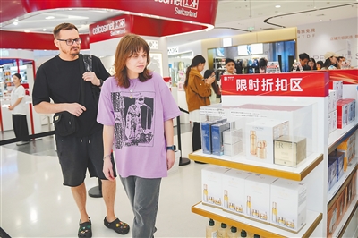外籍旅客在三亚中央商务区海旅免税城购买免税品。