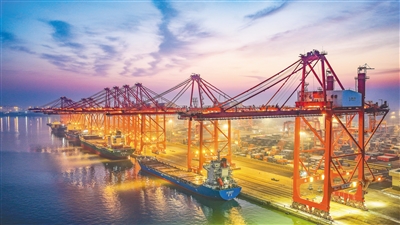 12月15日,轮船停泊在河北省唐山港京唐港区集装箱码头进行装卸作业。 新华社发