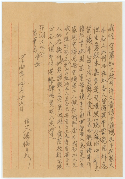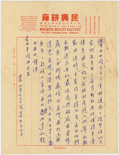 在黄褐色的信纸上,黄守琇对收信人黄守第说:“守第弟:你的来信已经收到了,得知在家情形喜甚,我处情形依旧,勿念。”接着,黄守琇述说了一些家常事,如孩子升学了,家里添丁了,同时也有对在南洋生计的担忧:“生意方面非常冷淡,物价天天提,如果长此以往,很难维持。”