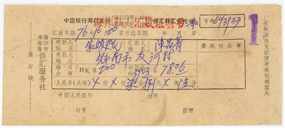 华侨陈昌菁寄给家嫂严秀英的侨批中的汇款单。
