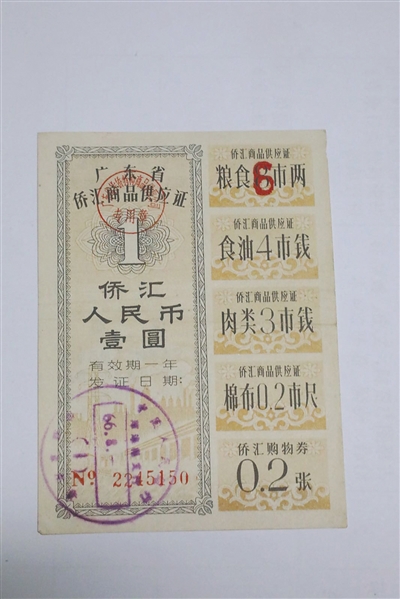 在种类众多的票证中,“侨汇票证”较为特殊。海南省档案馆收藏的一张“广东省(海南建省前归广东管辖)侨汇商品供应证”分为主券和副券:主券盖有广东省华侨特种商品公司专用章,标注面值“侨汇人民币壹圆”,有效期一年;副券包含多张票证——粮食6市两,食油4市钱,肉类3市钱,棉布0.2市尺等。史振卿介绍,侨汇商品供应证是国家为鼓励侨汇、优待侨眷发行的凭证,可用于购买当时市面上较为紧缺的粮油、日用品等,成为联结海外侨胞与侨眷的特殊纽带。