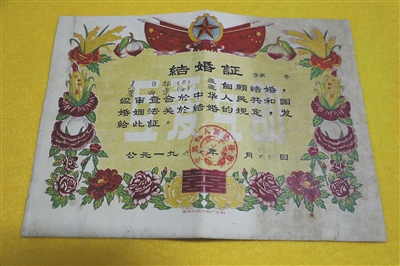 历史的车轮不断向前,一张1954年的结婚证呈现出截然不同的面貌:“文昌县人民政府印”十分显眼,设计简朴庄严,国旗、齿轮、作物丰收等图案突出,有两个大“囍”字铺底,行文特别提到“男女双方自愿结为夫妻……与《中华人民共和国婚姻法》的规定相符”。“新中国将婚姻彻底纳入法律框架,1950年《中华人民共和国婚姻法》的颁布施行具有里程碑式的意义,它从根本上确立了男女婚姻自由、一夫一妻、男女权利平等的原则。”史振卿说。