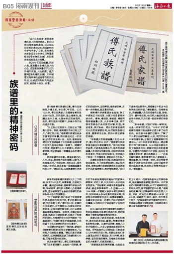 “为了修新谱,我们走访了有海南傅氏宗亲居住的相关村庄,累计收集旧族谱、手抄本数十册。”傅红日介绍,收集的分支族谱中,不乏清同治、光绪年间的珍贵版本,这些旧谱的复印版,也已全部捐赠给海南省档案馆。他坦言,收集这些旧族谱,既是为了续修族谱,也是为了抢救历史资料,为海南历史文化研究提供一份基础资料,“先辈们曾多次修编族谱,为我们留下了无比珍贵的历史文化遗存”。