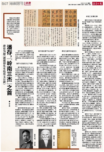 康有为之论,其实后人也可读到这些文字:“清咸同间有岭南三孝廉者,文昌潘孺初户曹存,及邓铁香鸿胪承修,遂溪陈逸山农部乔森也。孺初独行卓识,尤为士论所推。”(王逸塘编《今传是楼诗话》,《国闻周报》1927年第36期)相比之下,康有为所论更早,而且直抒胸臆,毫不掩饰对潘存的推崇。