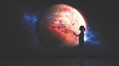 一位小朋友在位于湖北武汉的中国建筑科技馆沉浸式探索火星的奥秘。