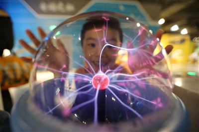 一位小朋友在江苏扬州科技馆观赏“辉光球”。