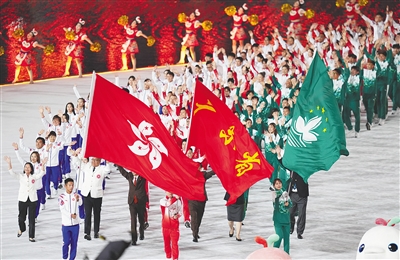 ⑦11月9日,广东省体育代表团、香港特别行政区体育代表团和澳门特别行政区体育代表团在第十五届全国运动会开幕式上共同入场。