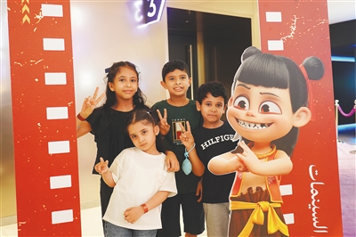 ⑧6月25日,在沙特阿拉伯利雅得,观众在《哪吒之魔童闹海》的展板前留念。