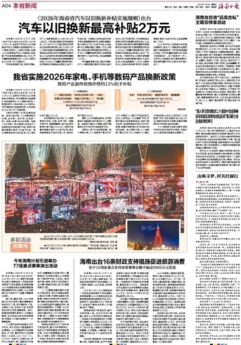 本报海口2025年12月31日讯(海南日报全媒体记者罗霞)2025年12月31日,省商务厅印发《2026年海南省支持家电、手机等数码产品换新补贴实施细则》(以下简称《细则》)。根据《细则》,我省实施2026年家电、手机等数码产品换新政策,补贴活动自2026年1月1日起实施。《细则》明确了补贴范围和标准。家电产品方面,个人消费者购买冰箱(含冰柜)、洗衣机(含洗烘一体)、电视、空调(含中央空调)、电脑(不含平板)、热水器等6类家电中1级能效或水效标准的产品,按照产品最终销售价格的15%给予补贴。每位消费者每类产品可补贴1件,每件补贴不超过1500元。