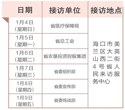 1月4日至9日,省医疗保障局、省总工会、省农垦投资控股集团、省委组织部、省委宣传部、省委统战部相关负责人将在海口市美兰区大英山西二街4号省人民来访服务中心接访群众。