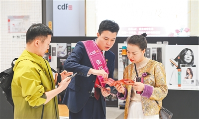③元旦假期,在中免集团海口日月广场免税店,工作人员向游客介绍免税政策。新华社记者 杨冠宇 摄