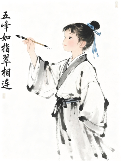 少年丘濬作《五指参天》诗图。罗安明AI生成