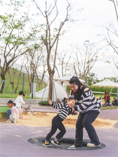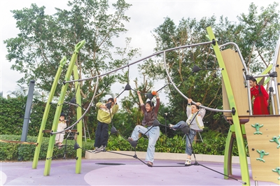 这里有大孩子能挑战的平衡绳项目,也有连1岁小朋友都可以安全玩耍的攀爬网。沙池里,父亲带着孩子操纵挖掘机挖沙子;蹦床上,母女牵手蹦高,发辫在空中飞扬;凉棚下,老人们靠着弧形座椅悠闲地唠嗑……最受欢迎的恐怕是旋转式跷跷板,不仅孩子抢着玩,大人也排队等座,甚至能看到大人玩得开心、孩子在一旁巴巴观望的有趣画面。