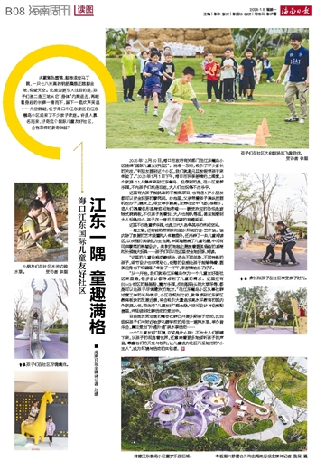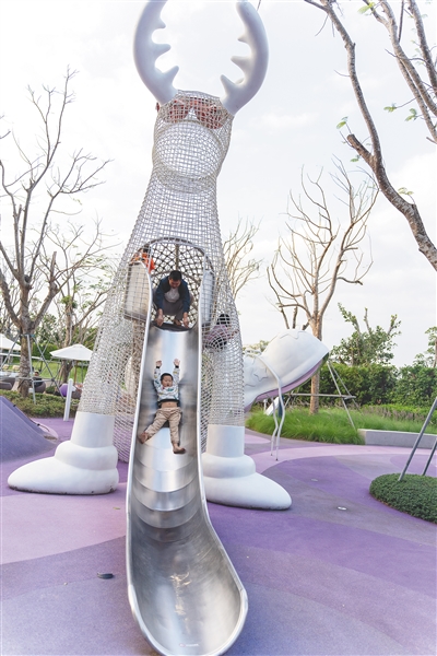 ■ 海南日报全媒体记者 孙婧头戴紫色墨镜,脚蹬漆皮马丁靴,一只七八米高的钢筋麋鹿正翘脚坐地,仰望天空。比造型更引人注目的是,孩子们接二连三地从它“身体”内爬进去,再顺着身后的长梯一滑而下,留下一路欢声笑语……元旦假期,位于海口市江东新区的江东麓岛小区迎来了不少亲子家庭。许多人慕名而来,好奇这个国际儿童友好社区,会有怎样的新奇体验?