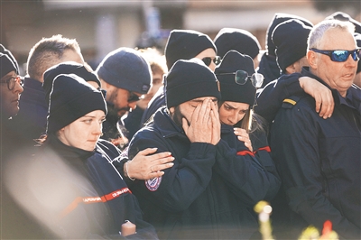 1月4日,在瑞士瓦莱州克朗-蒙大拿镇,人们在“星座”酒吧火灾事件遇难者悼念仪式上哭泣。新华社/美联