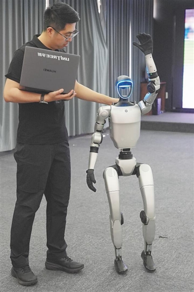 宇树人形机器人G1展示高举挥手动作。