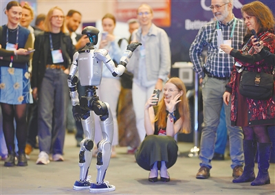 2025年11月12日,在葡萄牙里斯本,中国企业宇树科技的人形机器人和与会者在2025年网络峰会现场互动。