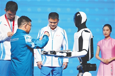 2025年11月14日,人形机器人在第十五届全国运动会拳击男子92公斤级颁奖仪式上为颁奖嘉宾递上奖牌。