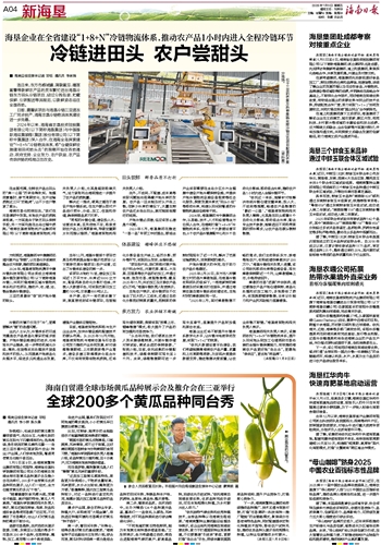 2024年,海垦集团与中集集团合作,从思路、技术、人才和经营等全方位深入合作,在海南打造“1+8+N”冷链物流体系,包括1个大数据运营平台,8个农产品冷链集配中心和N个自动化分拣线、移动组合冷库,推动农产品1小时内进入全程冷链环节。