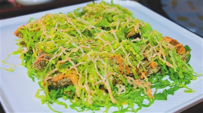 于是,一层酥脆的牛肉,一层脆甜的西生菜丝,再淋上柔滑的沙拉酱,如此反复,搭成了另一种形式的汉堡,使得冷与热、酥与脆、咸香与清甜在盘中相遇,就成了定安仙沟大院最受欢迎的仙沟牛肉创新美食之一——沙拉牛肉。