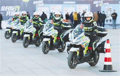 1月10日,在河北省石家庄市举办的“中国人民警察节”主题活动中,骑警进行摩托车技能展示。