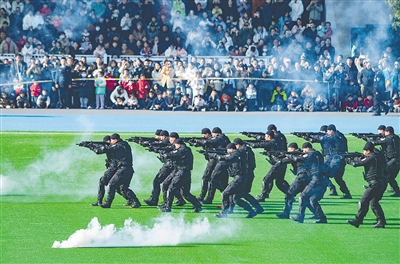 1月10日,浙江省金华市公安局在金华市警务训练基地举行警营开放活动,市民在观看防暴枪操演练。