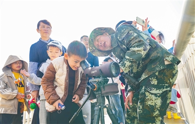 ③几名小学生排队使用专业设备观测鸟类。