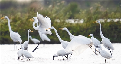 ②一群白鹭在湿地里栖息。
