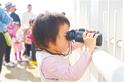 ①一名小朋友拿着望远镜学习观测。