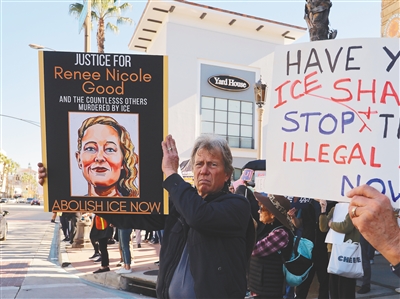 “不要ICE!不要三K党!不要法西斯美国!”当地时间10日,在加利福尼亚州南部城市帕萨迪纳,超过500名抗议者高喊口号、手举标语,聚集在市政厅附近一主要路口,经过的车辆纷纷鸣笛对抗议表示支持。当天的抗议活动由美国移民与海关执法局(ICE)执法人员7日在明尼苏达州明尼阿波利斯市射杀37岁美国公民蕾恩·妮科尔·古德引发,覆盖加州众多大小城镇,除帕萨迪纳外,还包括洛杉矶、旧金山、州首府萨克拉门托等,参加人数从百十人至数千人不等。