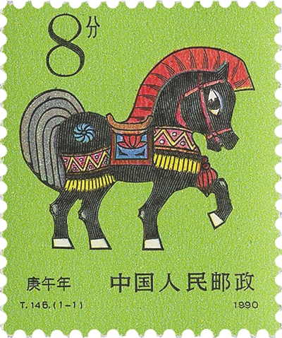 第一轮生肖邮票《庚午年》由邮电部于1990年1月5日发行,志号为T.146,邮票1套1枚。邮票图案为一匹稚拙可爱的小马驹,通体黑亮,马鬃火红,四蹄雪白。背景以一片绿色铺陈,既贴合马的自然生态环境,又象征着希望与春天,为骏马勾勒出一片可肆意驰骋的辽阔天地,充满诗意;小黑马脚踏绿意浓浓的草地,系着缰绳,佩戴着饰有红荷花的马鞍和鲜红的辔头,脖子上挂着带穗的铃铛,臀部还装饰着一朵似毛旋盛开的小花朵。值得称道的是,设计者准确地捕捉住了马扬起一只前蹄的刹那神态,仿佛立刻就要奔跑起来,整体画面蕴含迈出新步伐的象征意义。