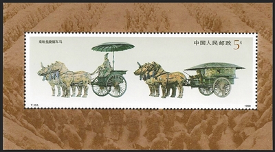 邮电部于1990年6月20日发行《秦始皇陵铜车马》邮票,全套2枚,志号为T.151,图案分别选取了秦始皇陵铜车马中的御官俑头像和铜马头;另发行小型张1枚,图案为秦始皇陵铜车马全貌。该小型张画面上,高车在前,安车在后,形成秦朝皇室车舆制度的缩影;背景采用秦始皇陵兵马俑陈列图,周围衬以灰棕暖色,既表现出自然朴拙、雍容典雅的艺术氛围,又再现了当年秦始皇出行车队“大驾卤簿”八十一乘车的浩荡威风。