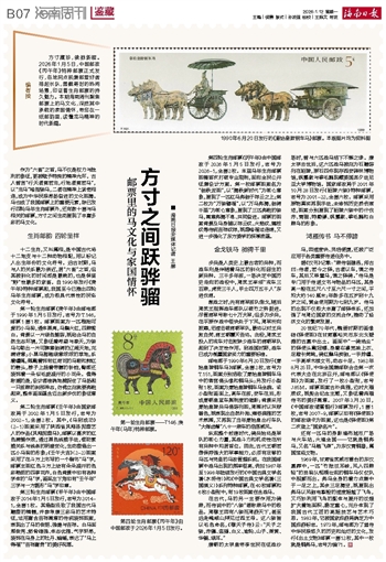 方寸藏珍,骏驰新程。2026年1月5日,中国邮政《丙午年》特种邮票正式发行,各地网点前集邮爱好者排起长队,盖戳寄封的热闹场景,印证着生肖邮票的持久魅力。本期海南周刊聚焦邮票上的马文化,深挖其中承载的家国情怀,带您在一纸邮韵里,读懂龙马精神的时代新篇。