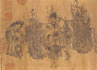 关于李嵩《货郎图》的图像内涵,向来多有探讨。尤其故宫博物院现藏本中“专医牛马小儿”“杂写文约”“明风水”“诵仙经”等,看似是广告幌子,实则寓意丰富。某种意义上,这一系列文字,并非随意题写,而是《货郎图》的“画眼”。有画评家称,这是将货郎的身份指向李嵩所在时代的社会背景——尊奉道教。实际上,无论后人如何推测,李嵩的《货郎图》作为货郎主题绘画的重要作品,从“风格”到“画意”,都展现出写实主义在南宋的风行。他以深厚的界画基础为依托,从一个市井小人物——货郎的视角出发,通过一系列图像和文字,隐蕴创作时的历史背景。画家以图鉴史,再现了南宋时代的物质文化,使之成为后人了解南宋社会生活的一部“图像志”。