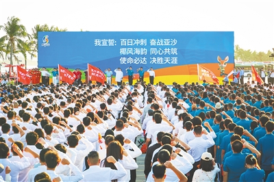 椰影婆娑,海涛和鸣。1月12日,三亚凤凰岛洋溢着激昂奋进的气息,“百日冲刺 奋战亚沙”——第六届亚洲沙滩运动会倒计时100天誓师大会在此举行。来自全省各条战线的12支方阵代表庄严宣誓,标志着亚沙会筹备工作进入全面冲刺阶段。